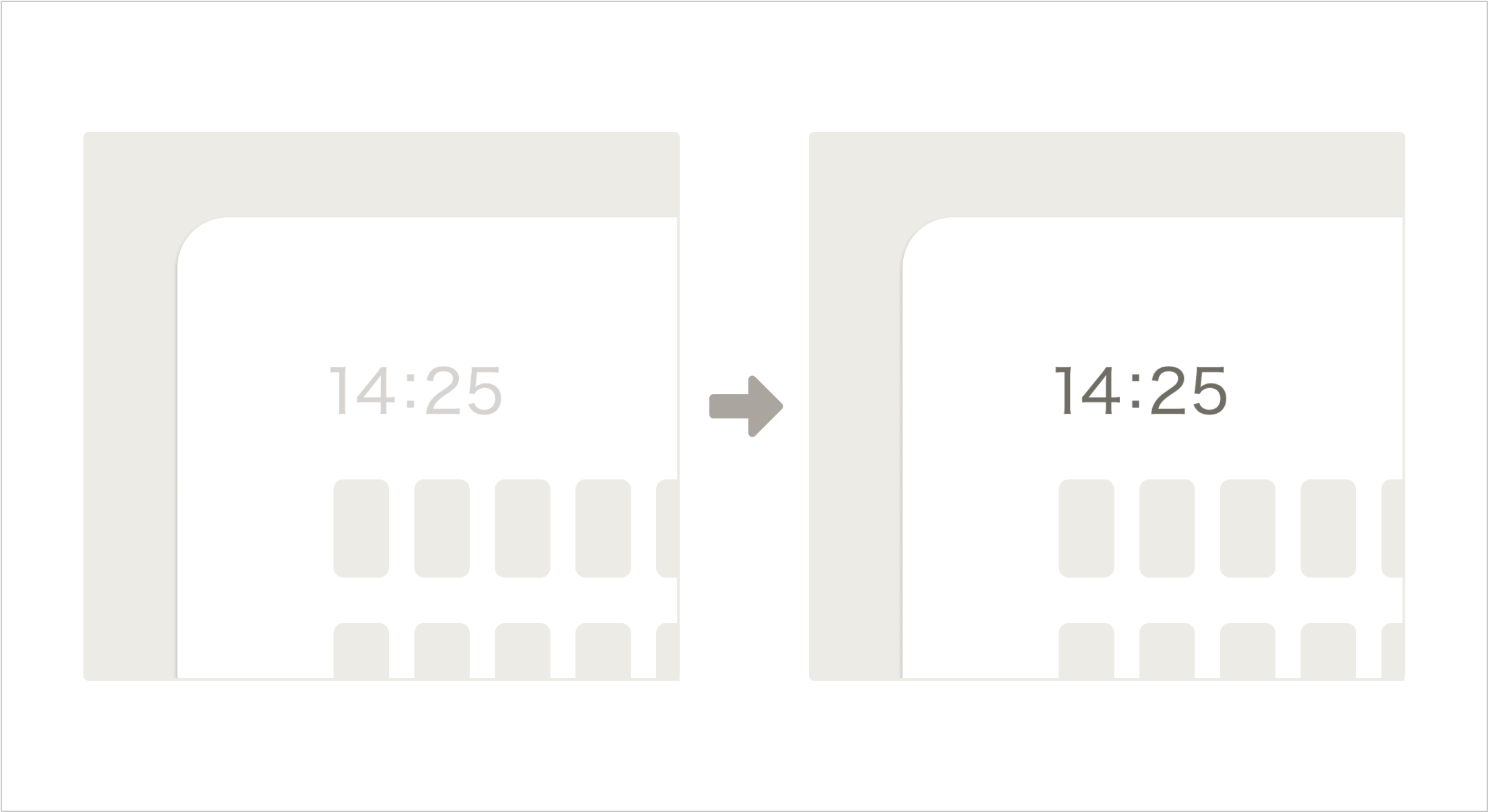 左側には明るい色のテキストが、右側には左側に比べて明度が低い色のテキストが表示されている。画面中央には矢印が配置されている。