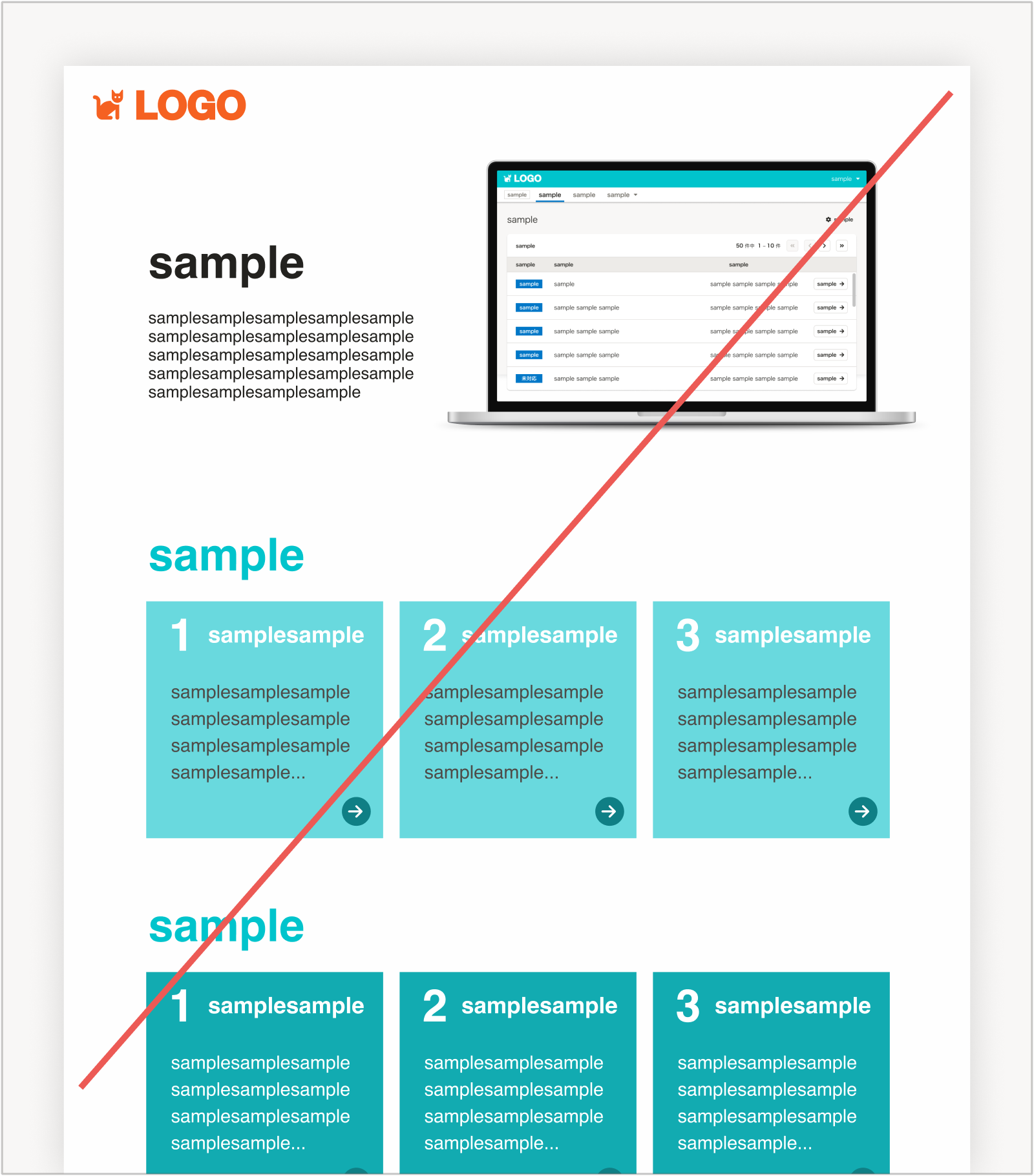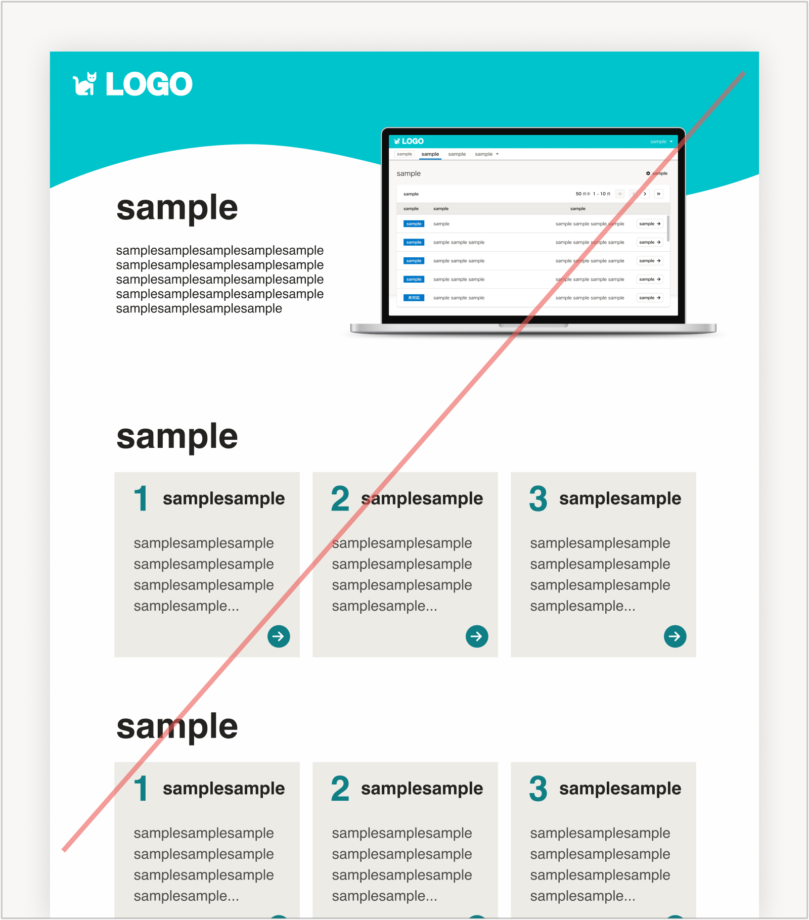 NG例のLPに赤い斜線が引かれている。背景色やテキストには主にSmartHR Blueやその近似色が利用されている。