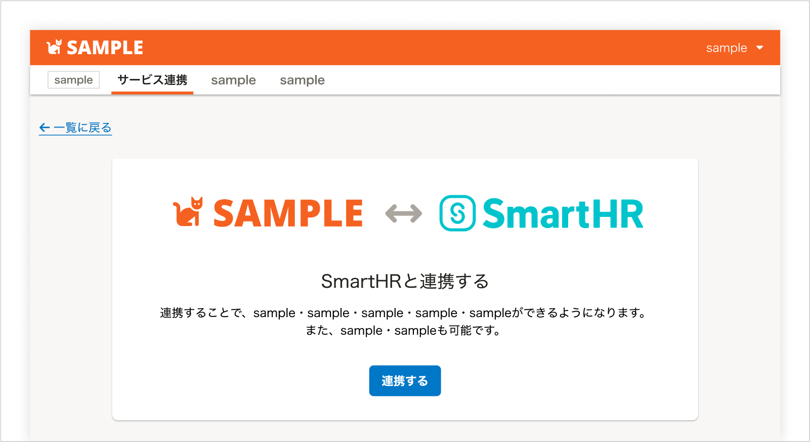 • 例2:ユーザーがSmartHRとの連携設定を行なうための操作画面 アプリ画面のOK例。SmartHRとの連携操作画面。アイキャッチとして、アプリロゴとSmartHRロゴを相互の矢印でつなぐ図が描かれている。