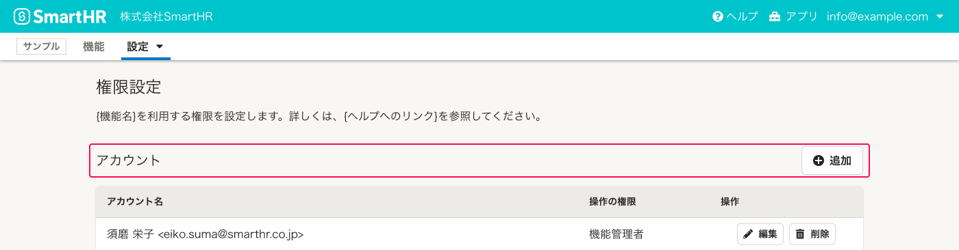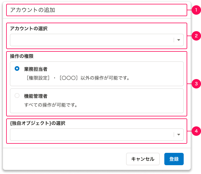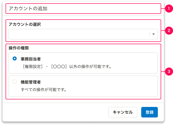 アカウントに対して操作の権限(役割)を設定します。以下に代表的な役割として 「機能管理者」「業務担当者」 の2つを定義します。必要に応じて見直してください。
