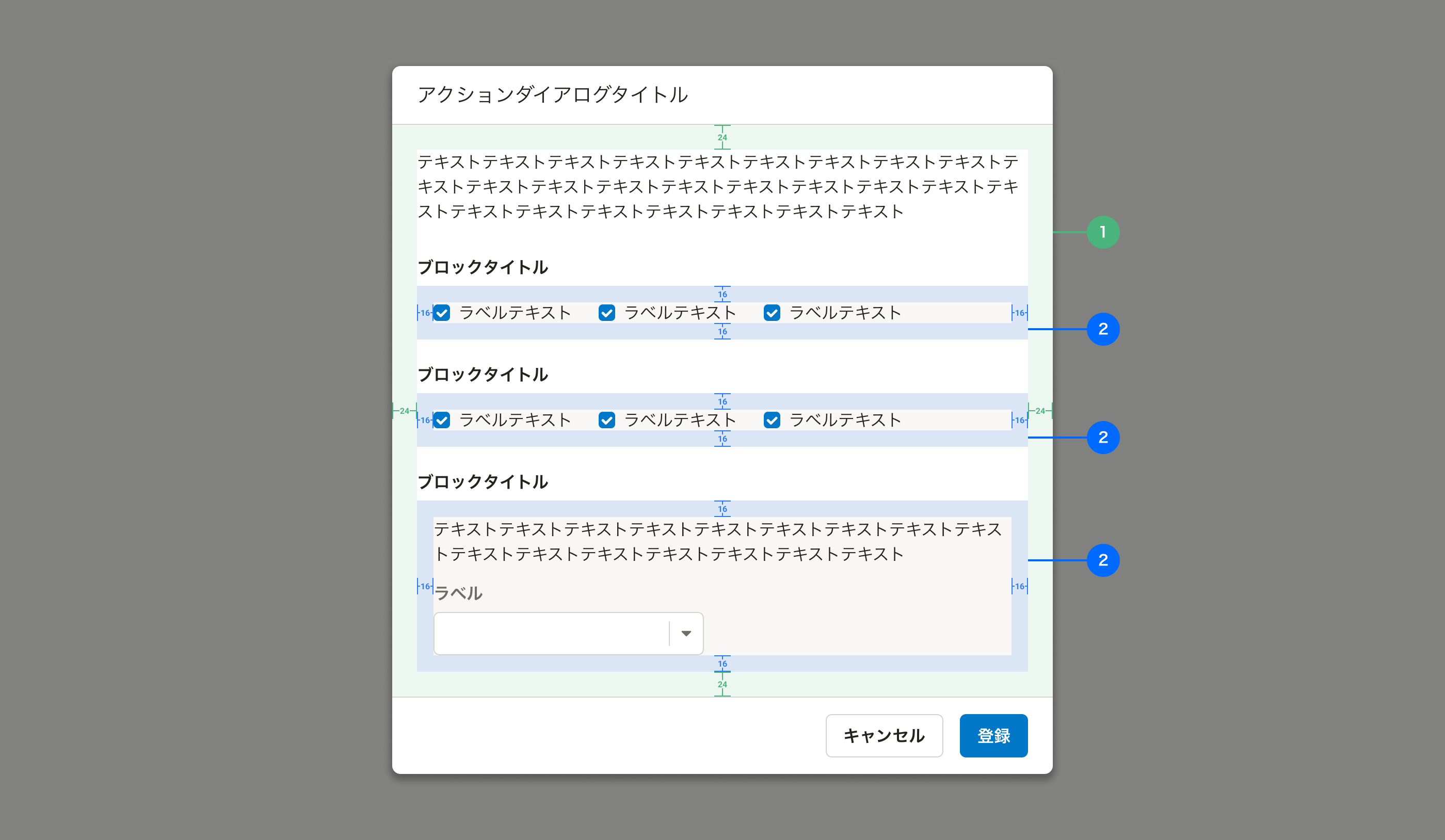 1.5(24px)- Dialogの各コンポーネントを使用することで、自動的に適用されます。